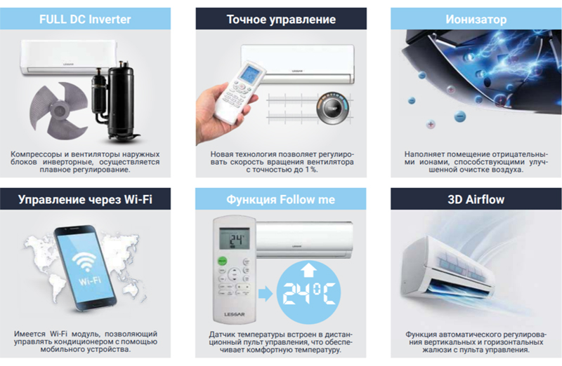 • Встроенный Wi-Fi — позволяет управлять кондиционером с помощью мобильного устройства.
