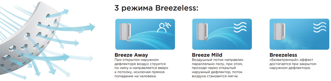 • Технология Breezeless — несколько тысяч мини-отверстий сконструированы с целью устранения неприятного воздействия холодного воздуха из блока, которое вы совершенно не почувствуете. Каждое отверстие задает свое направление воздушному потоку, сглаживая его и делая идеально мягким. Три режима рассеивания воздуха, делают воздушный поток максимально комфортным и прохладным.